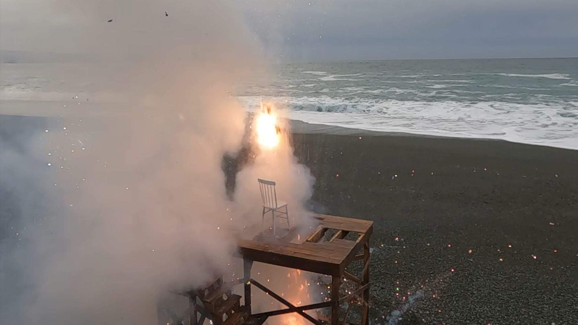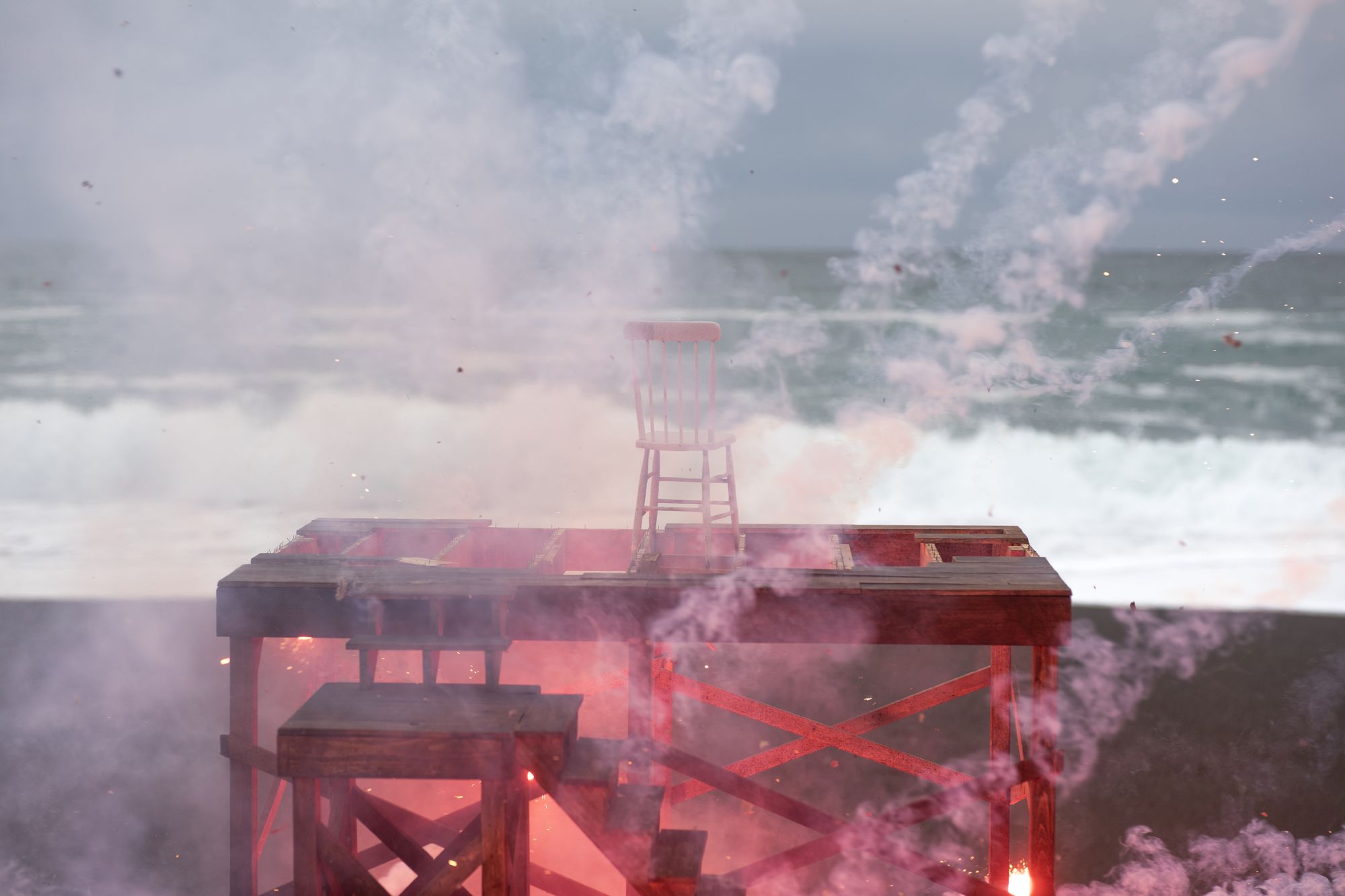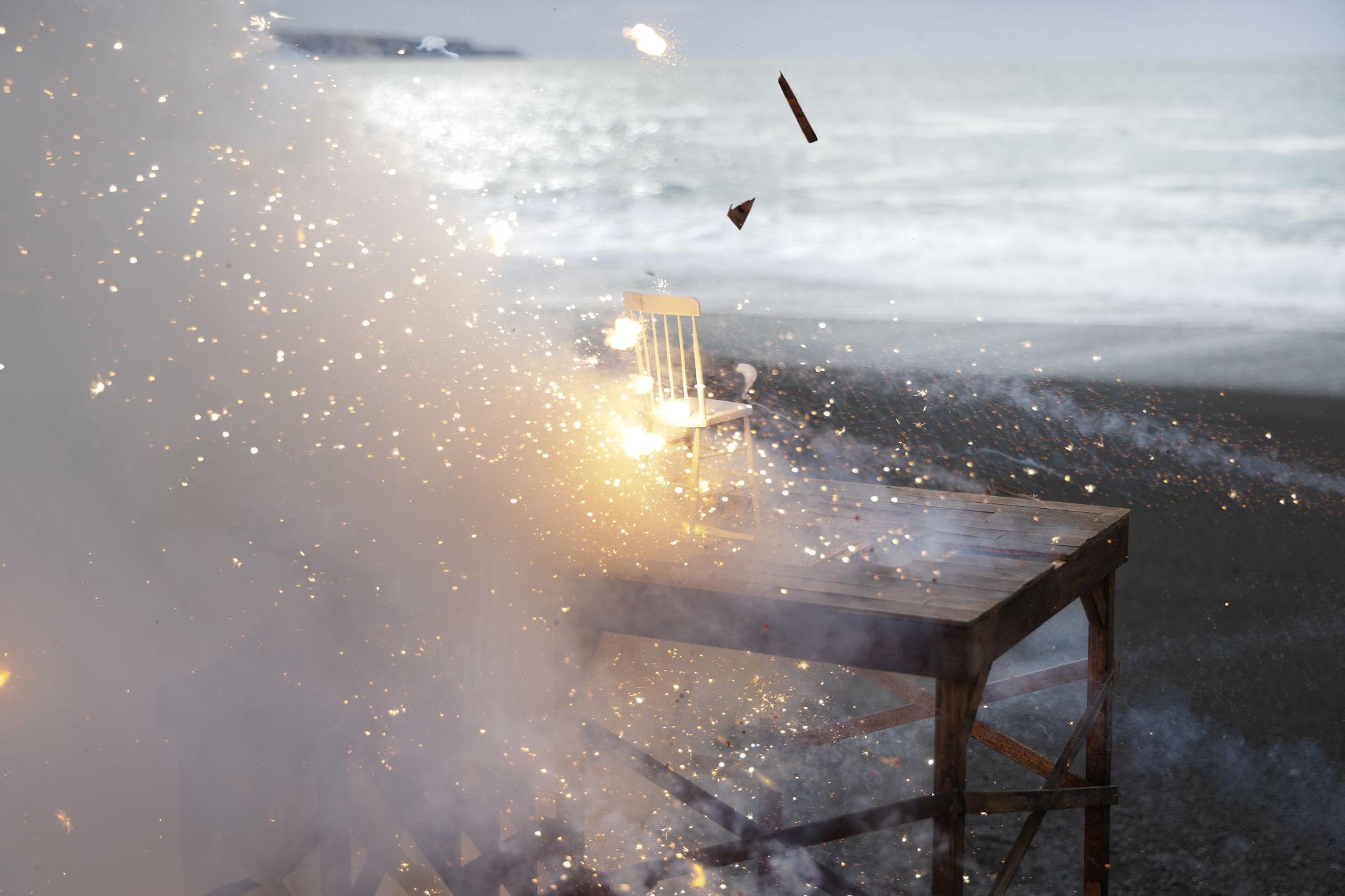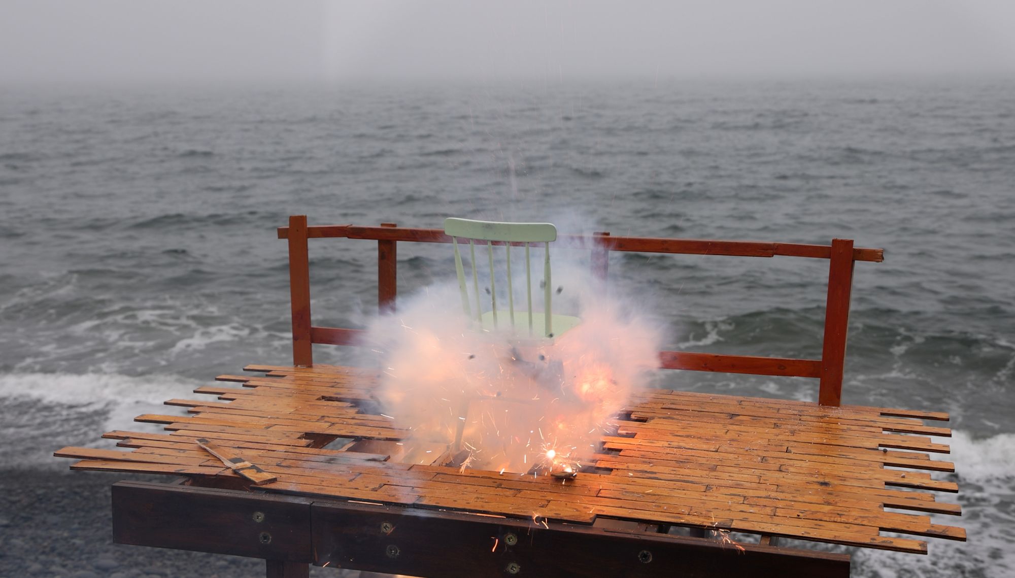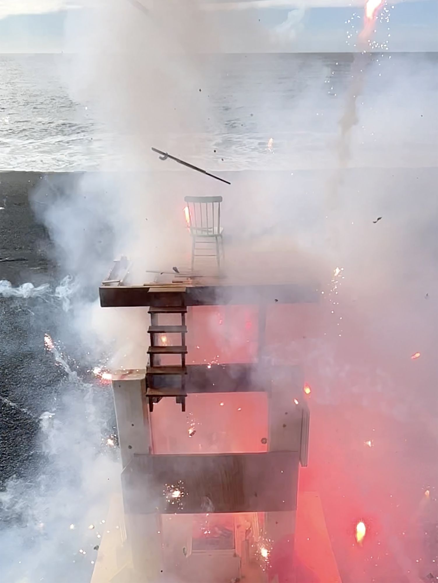 How best to express the breakdown of political and societal fabric? My approach has been to slowly build subject matter, with the intent of then manufacturing its sudden undoing. These new images explore disintegration of handmade structures that function as support systems; decks, stages and scaffolding. Detonations destroy the platforms in short order and in spectacular fashion, echoing the shock and awe of a media world that’s entertaining us to death.