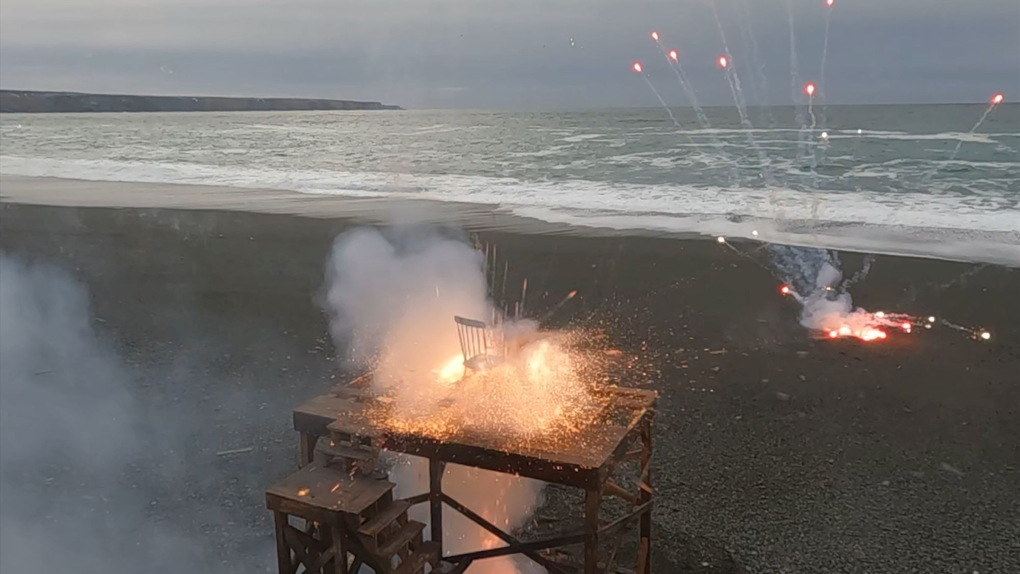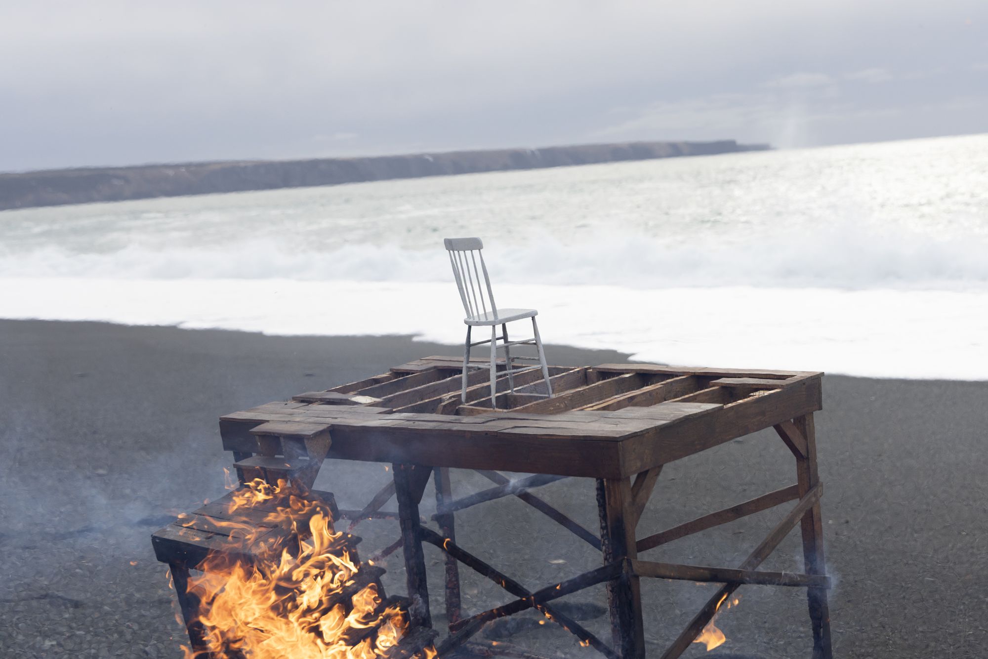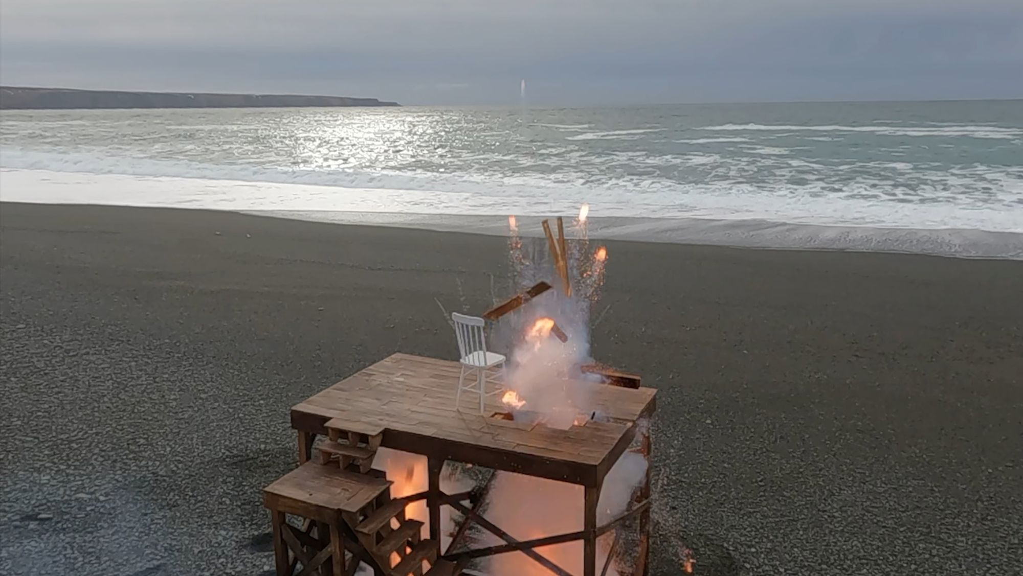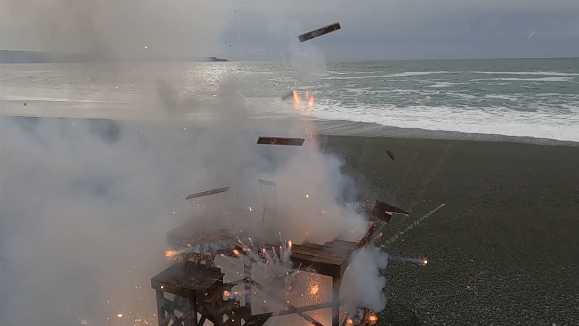 How best to express the breakdown of political and societal fabric? My approach has been to slowly build subject matter, with the intent of then manufacturing its sudden undoing. These new images explore disintegration of handmade structures that function as support systems; decks, stages and scaffolding. Detonations destroy the platforms in short order and in spectacular fashion, echoing the shock and awe of a media world that’s entertaining us to death.