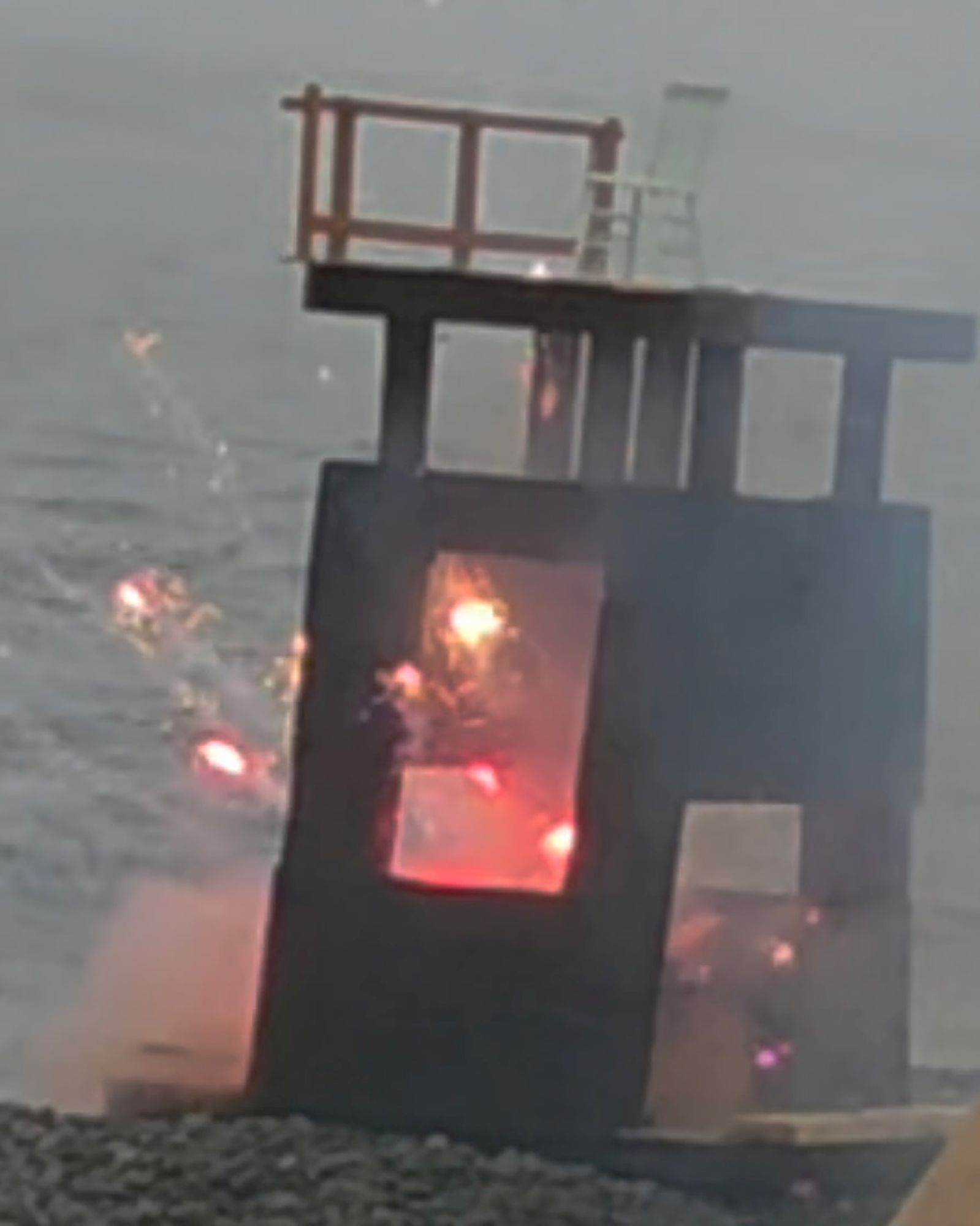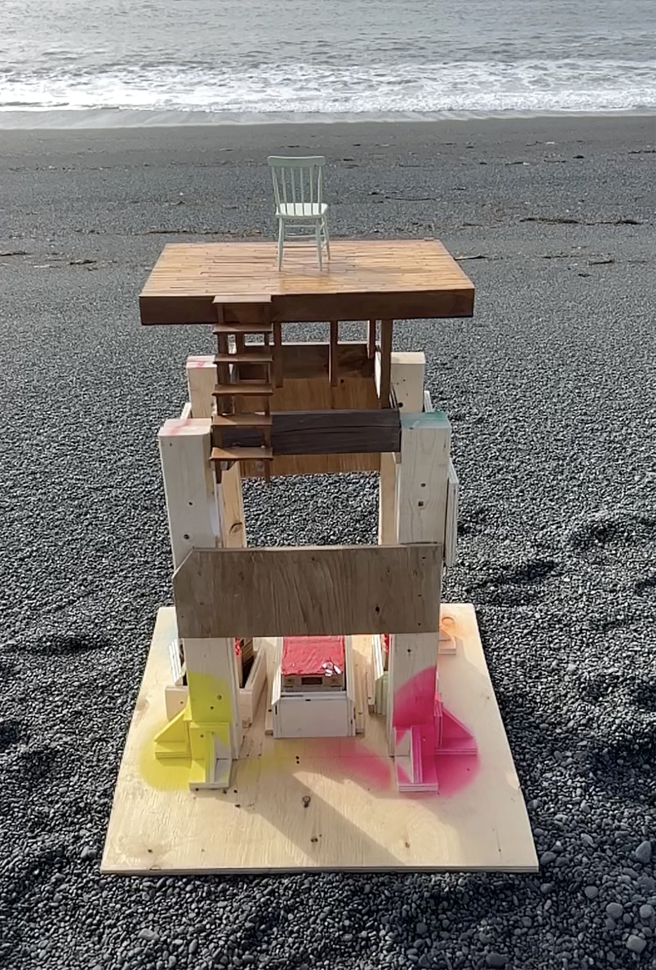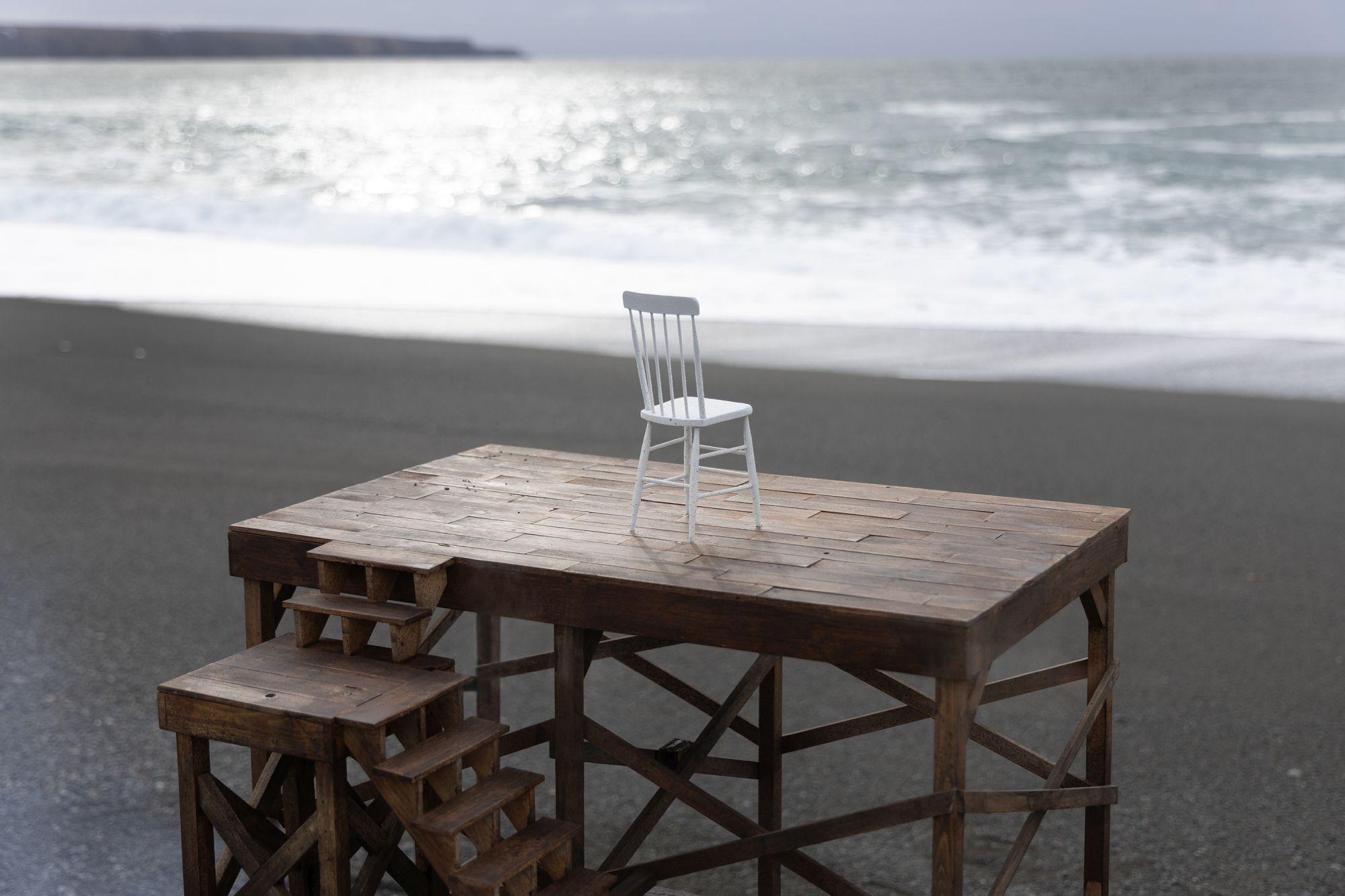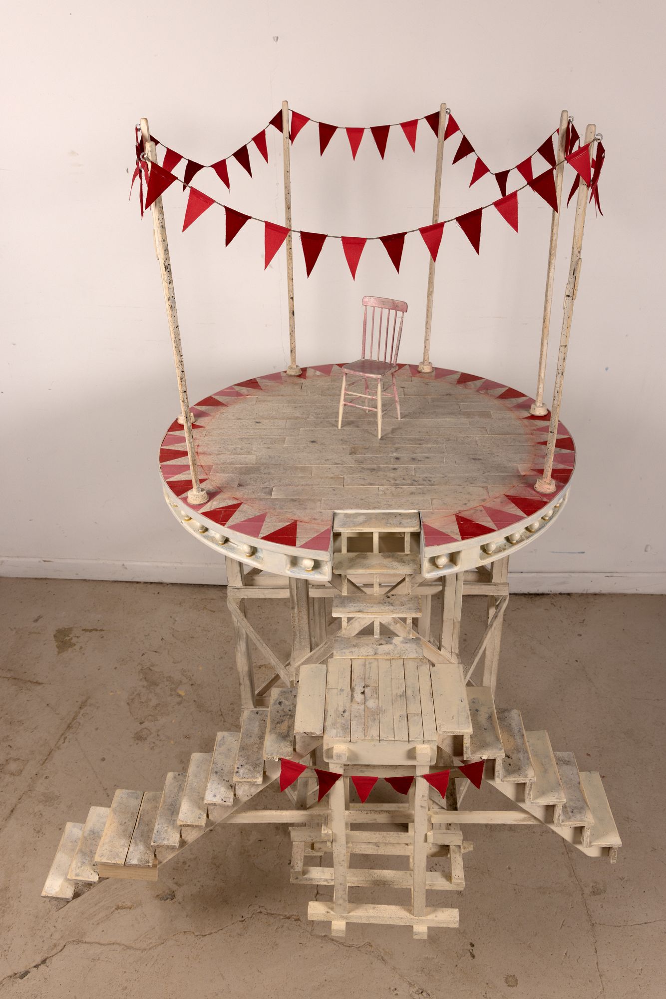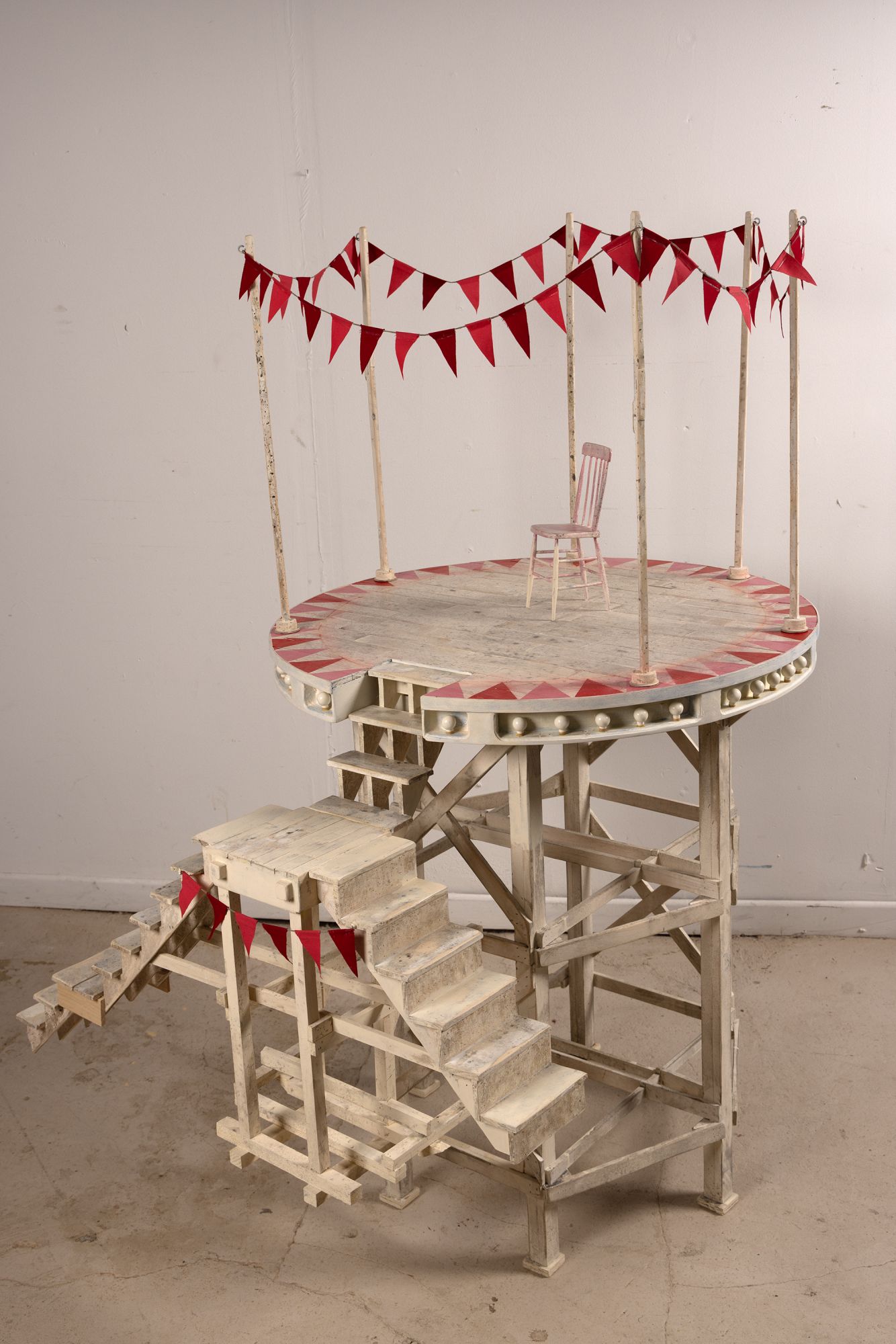 How best to express the breakdown of political and societal fabric? My approach has been to slowly build subject matter, with the intent of then manufacturing its sudden undoing. These new images explore disintegration of handmade structures that function as support systems; decks, stages and scaffolding. Detonations destroy the platforms in short order and in spectacular fashion, echoing the shock and awe of a media world that’s entertaining us to death.